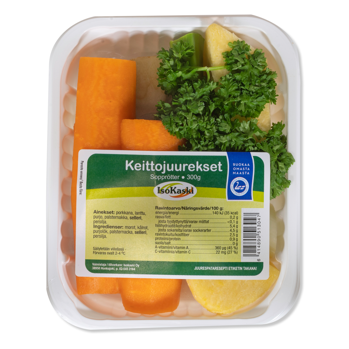 Ainesosat: porkkana, lanttu, purjo, palsternakka, selleri, persilja